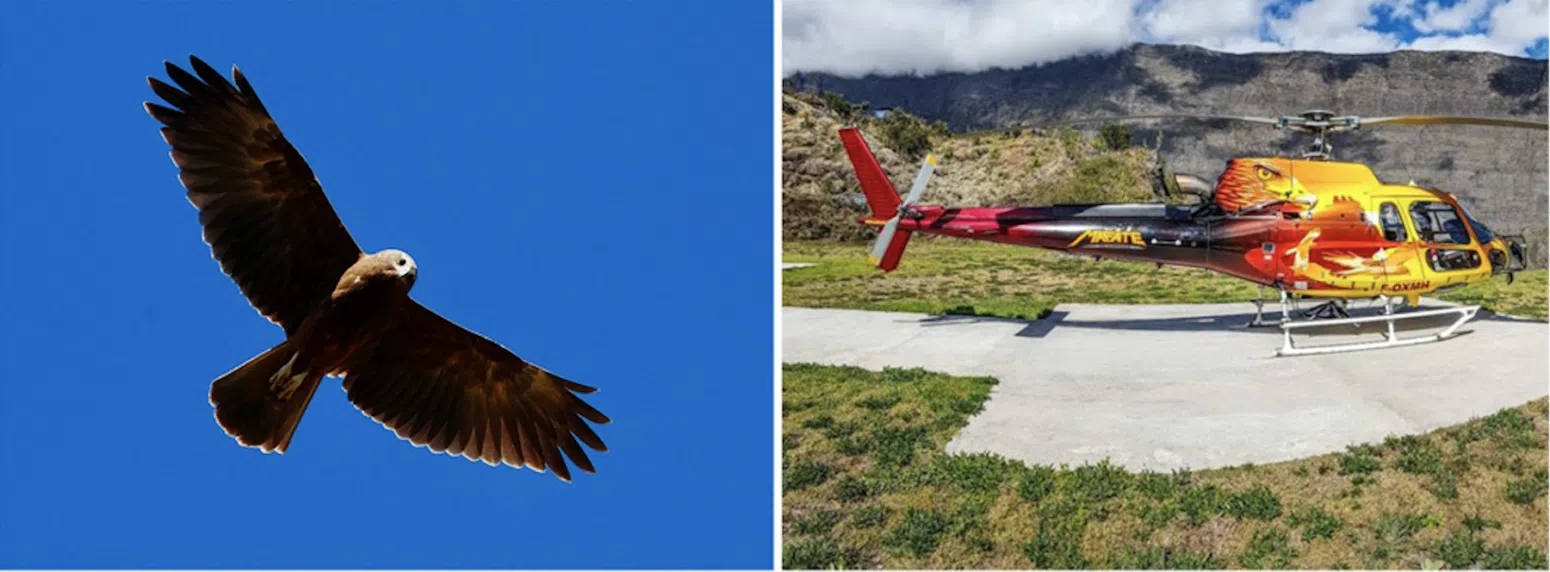 La décoration artistique des hélicoptères a une symbolique bien locale. A savoir que nos deux appareils représentent deux oiseaux endémiques de La Réunion :